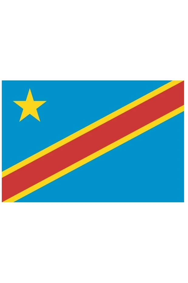 Флаг Демократической Республики Конго представляет прямоугольное полотнище синего цвет с тремя полосами по диагонали желтого, красного, желтого цветов. В крыже расположена желтая пятиконечная звезда. Синий цвет олицетворяет мир. Красный цвет символизирует кровь. Желтый цвет означает благополучие страны. Имеет соотношение сторон 3:4.