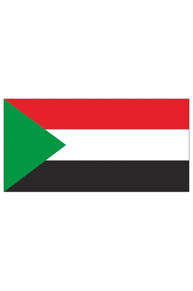 Флаг Судана представляет прямоугольное полотнище с тремя горизонтальными полосами красного, белого, зеленого (сверху вниз) цветов с зеленым треугольником у древка. Цветовая гамма относится к панарабским цветам. Красный цвет означает борьбу патриотов за независимость. Белый цвет мира. Черный цвет символизирует Судан, по-арабски Судан означает "Страна черных". Зеленый цвет обозначает ислам. Имеет соотношение сторон 1:2.