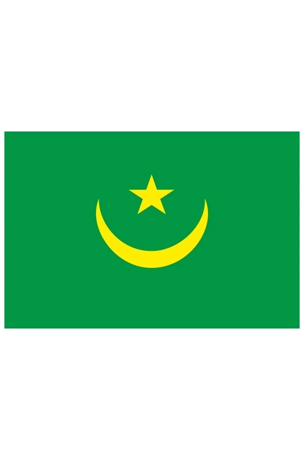 Флаг Мавритании представляет собой прямоугольное полотнище зеленого цвета. В центре расположен желтый полумесяц с пятиконечной звездой желтого цвета. Зеленый цвет символизирует ислам. Зеленый цвет также олицетворяет светлое будущее. Желтый цвет является символом пустыни Сахара. Он имеет соотношение сторон 2:3. Оттенок зеленого ближе к пурпурно-зеленому.