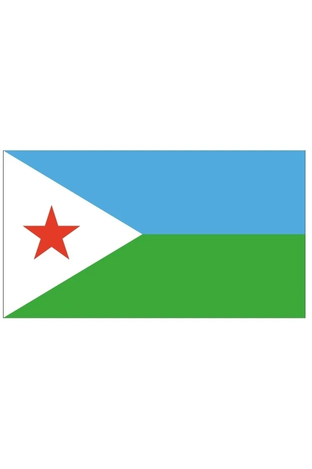 Флаг Джибути представляет собой прямоугольное полотнище с двумя горизонтальными полосами синего и зеленого цветов с белый треугольником у древка. В центре белого треугольника располагается красная пятиконечная звезда. Зеленый и синий цвета олицетворяют две основные этнические группы населения, проживающих в стране: песа и афаров. Красная звезда – символ борьбы за независимость. Флаг имеет соотношение сторон 2:3.