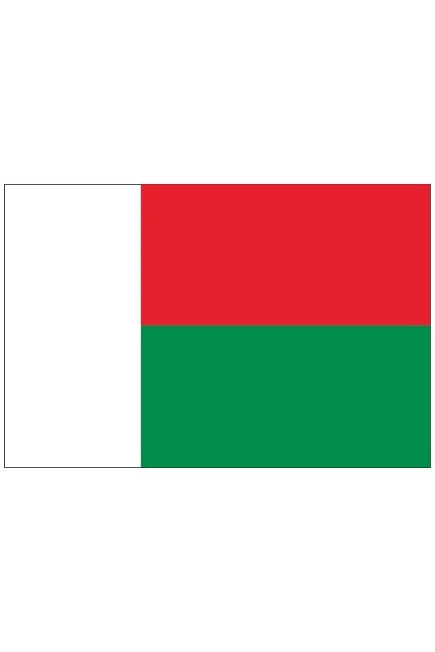 Флаг Мадагаскара представляет прямоугольное полотнище с двумя горизонтальными полосами красного и зеленого цветов. У древка расположена белая вертикальная полоса. Флаг был утвержден 21 октября 1958 года. Он имеет соотношение сторон 2:3. Красный и белый цвета являются цветами самого крупного народа мерина. Зеленый цвет принадлежит к племени ховов.
