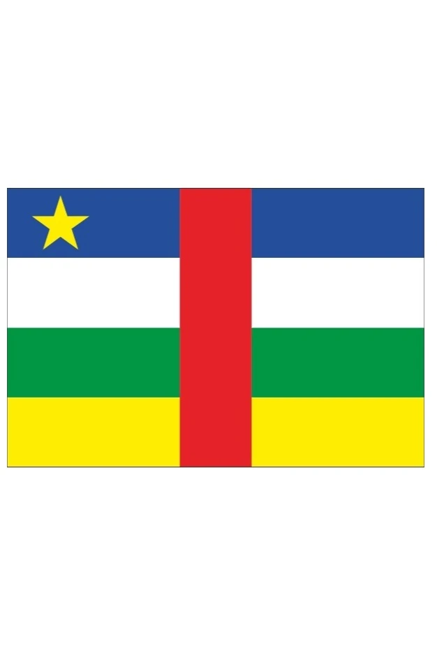 Флаг ЦАРа (Центральноафриканской Республики) представляет собой прямоугольное полотнище с четырьмя горизмонтальными полосами темно-синего, белого, зеленого, желтого (сверху вниз) цветов с вертикальной красной полосой в середине и желтой пятиконечной звездой в крыже. Флаг представляет собой сочетание панафриканских цветов и цветов флага Франции. Имеет соотношение сторон 3:5.