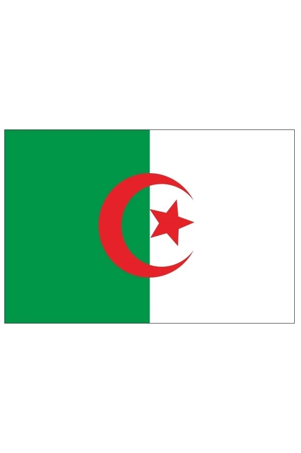 Государственный флаг Алжира состоит из двух вертикальных полос одинаковой ширины зелёного и белого цвета. В центре расположены красная звезда и полумесяц. Белый цвет символизирует чистоту, зелёный цвет — цвет ислама. Полумесяц также является исламским символом. Помимо этого, цвета также символизируют: красный — свободу, зелёный — веру в победу, белый — траур по погибшим в борьбе героям.