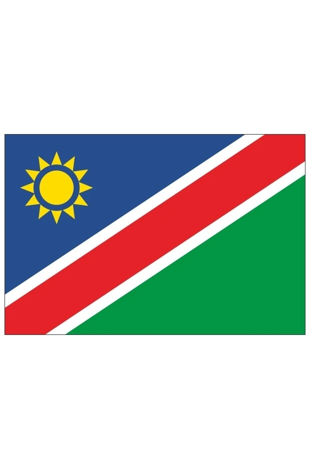 Государственный флаг Намибии должен быть прямоугольным в пропорции три по длине к двум по ширине, скошенным в синюю, белую и зелёную обратные перевязи; белая обратная перевязь, которая должна быть в одну третью часть ширины флага, обременена другой, красной, в одну четверть ширины флага. Вверху у древка должно быть золотое солнце с двенадцатью лучами, диаметр которого должен составлять одну треть ширины флага, а его вертикальная ось должна быть на расстоянии одной пятой от древка, расположенное равноудалённо от верхнего края и от обратной перевязи. Лучи, каждый из которых составляет две пятых радиуса солнца, имеют в своём основании синее кольцо, которое должно быть в одну десятую радиуса солнца. Соотношение сторон 2:3.