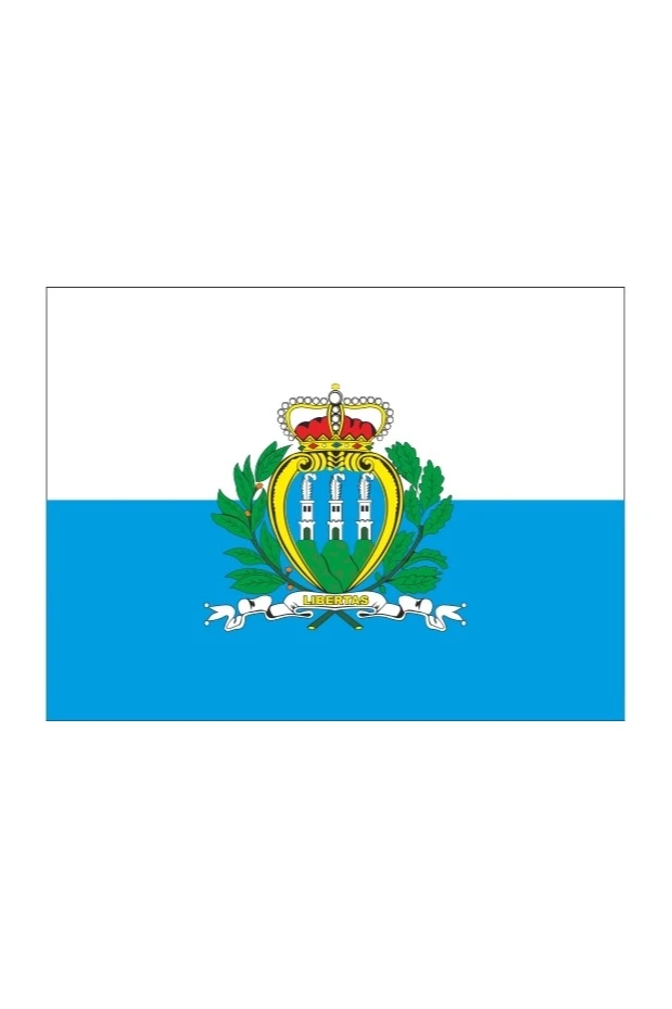 Флаг Сан-Марино представляет собой прямоугольное полотнище с соотношением сторон 3:4, состоящее из двух горизонтальных равновеликих полос: верхней — белой и нижней — светло-голубой. В центр флага помещено изображение герба Сан-Марино — щита с изображением трёх башен — Гуаита, Честа и Монтале, окружённого ветвями дуба и лавра. Щит венчает корона, снизу расположена лента с девизом Сан-Марино — «Libertas» (Свобода).