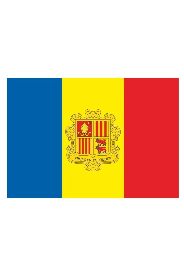 Флаг Андорры представляет собой прямоугольное полотнище состоящее из трёх вертикальных неравных синей, жёлтой и красной полос. В центре средней жёлтой полосы — герб Андорры. Этот триколор является флагом Андорры с XIX века. Синий и красный — цвета Франции, а жёлтый и красный — Испании: вместе они отражают франко-испанское покровительство над Андоррой. В центре флага — щит с изображением митры и посоха Урхельского епископа и двух быков, символизирующих совместное управление Франции и Испании; красные полосы на жёлтом фоне — цвета Каталонии. Девиз на щите: «Единство делает сильным» (лат. Virtvs Vnita Fortior).