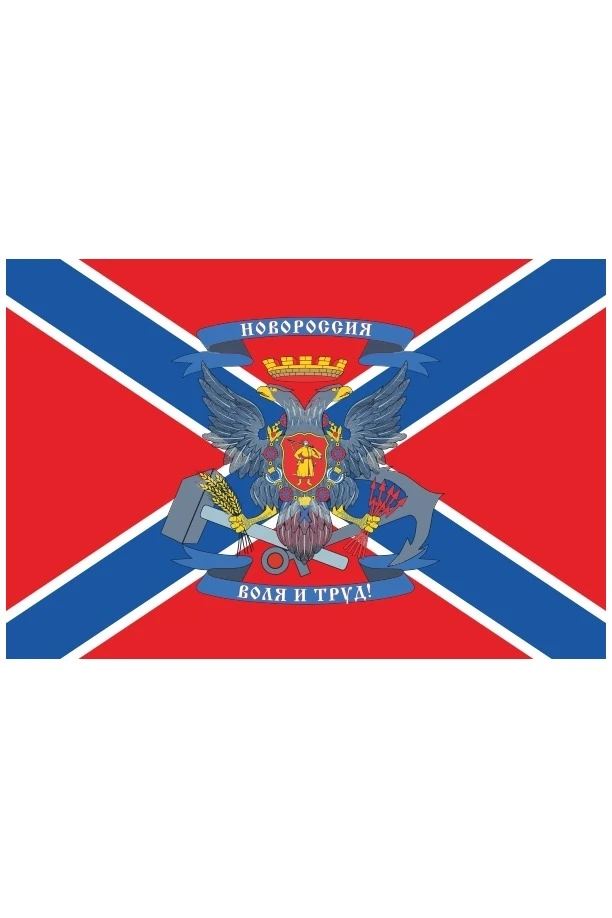 Флаг представляет собой прямоугольное полотнище красного цвета с косым крестом (Андреевский крест) синего цвета с белой окантовкой. Проект герба Новороссии представляет собой двуглавого орла, на груди которого расположен щит польской геральдической формы (барочный щит) красного цвета, в центре которого расположен казак золотого цвета. На девизной ленте герба написано: "Воля и труд", что олицетворяет независимость, а также стремление к самообеспечению и усердию. Позади орла расположены пересечённые молот и якорь. В верхней части герба расположена надпись: "Новороссия". В когтях орла зажаты колосья пшеницы и стрелы красного цвета. Над головой орла расположена башенная корона с пятью башнями.