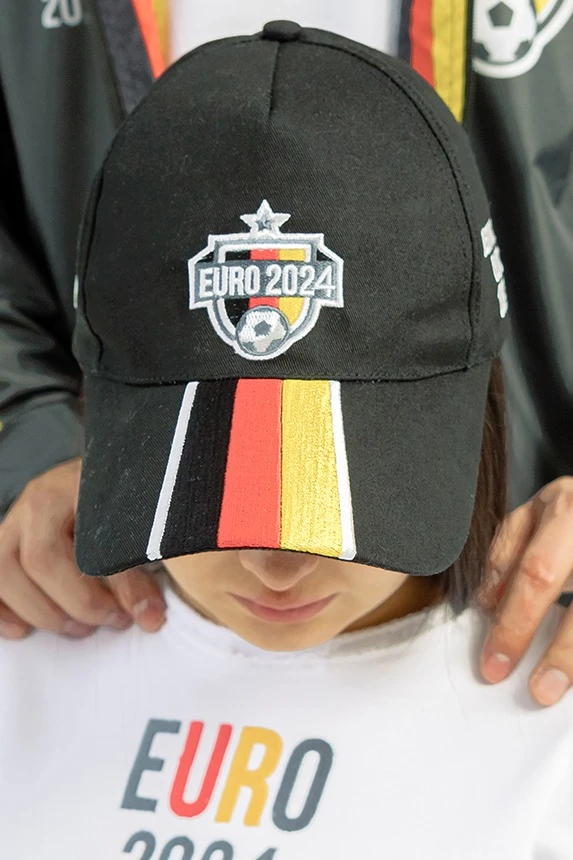 С совмещением элементов вышивки на клиньях бейсболки, элементы прямой печати - без совмещения.