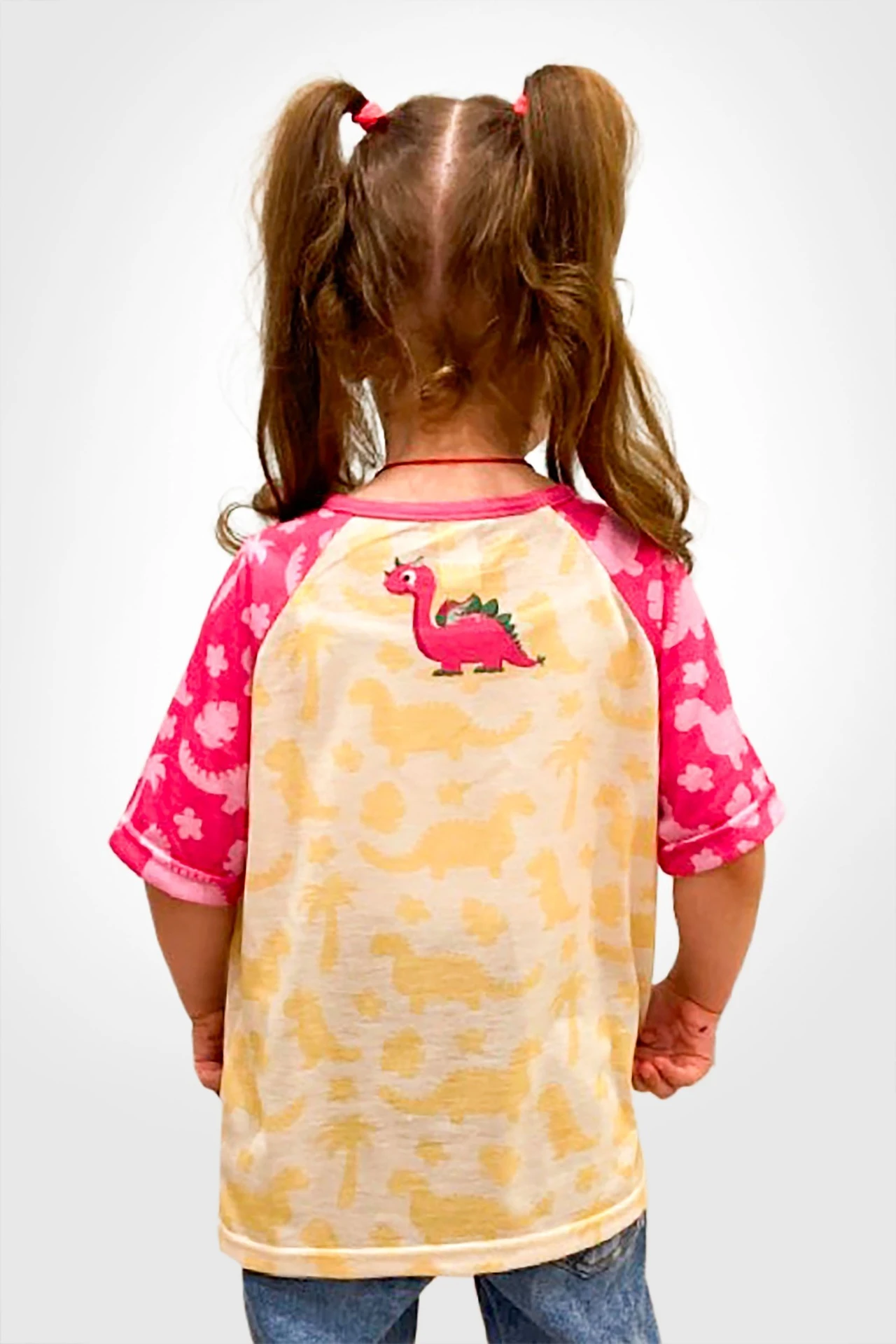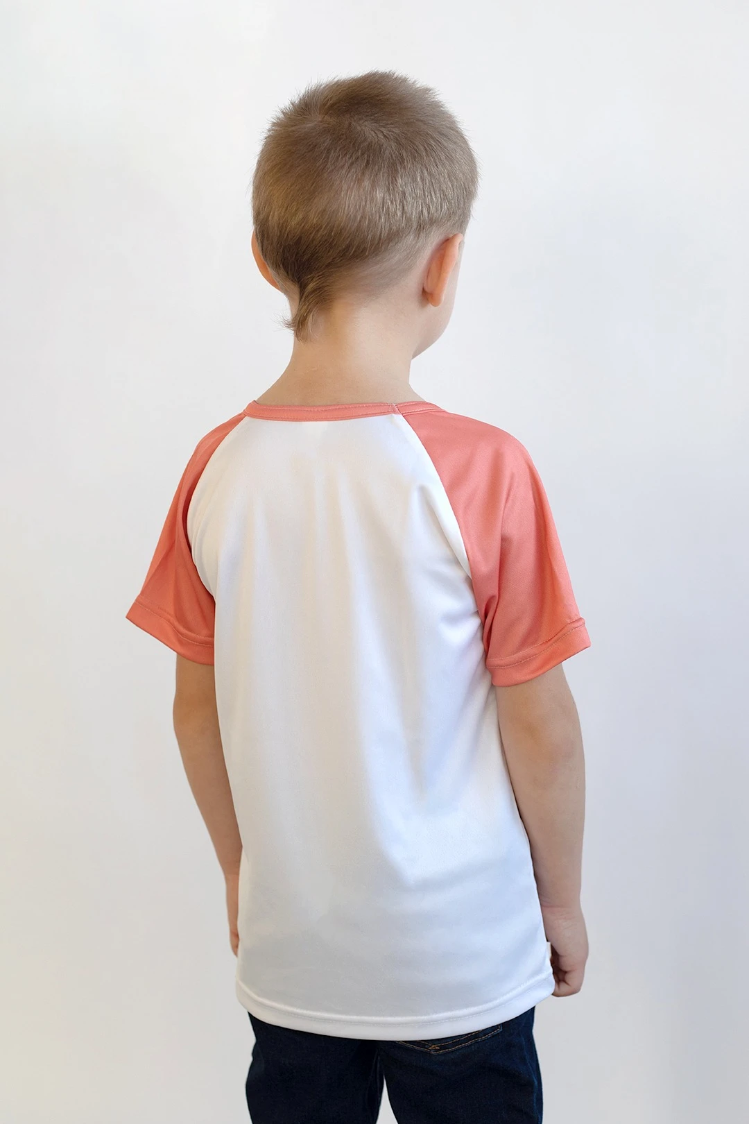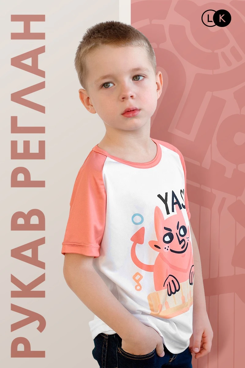 Модель. Прямой силуэт. Рукав короткий, реглан. Футболка имеет боковые швы без разрезов по низу изделия. Оформление горловины руликом (кантом) из основной ткани или рибаной. Форма ворота О-образная.