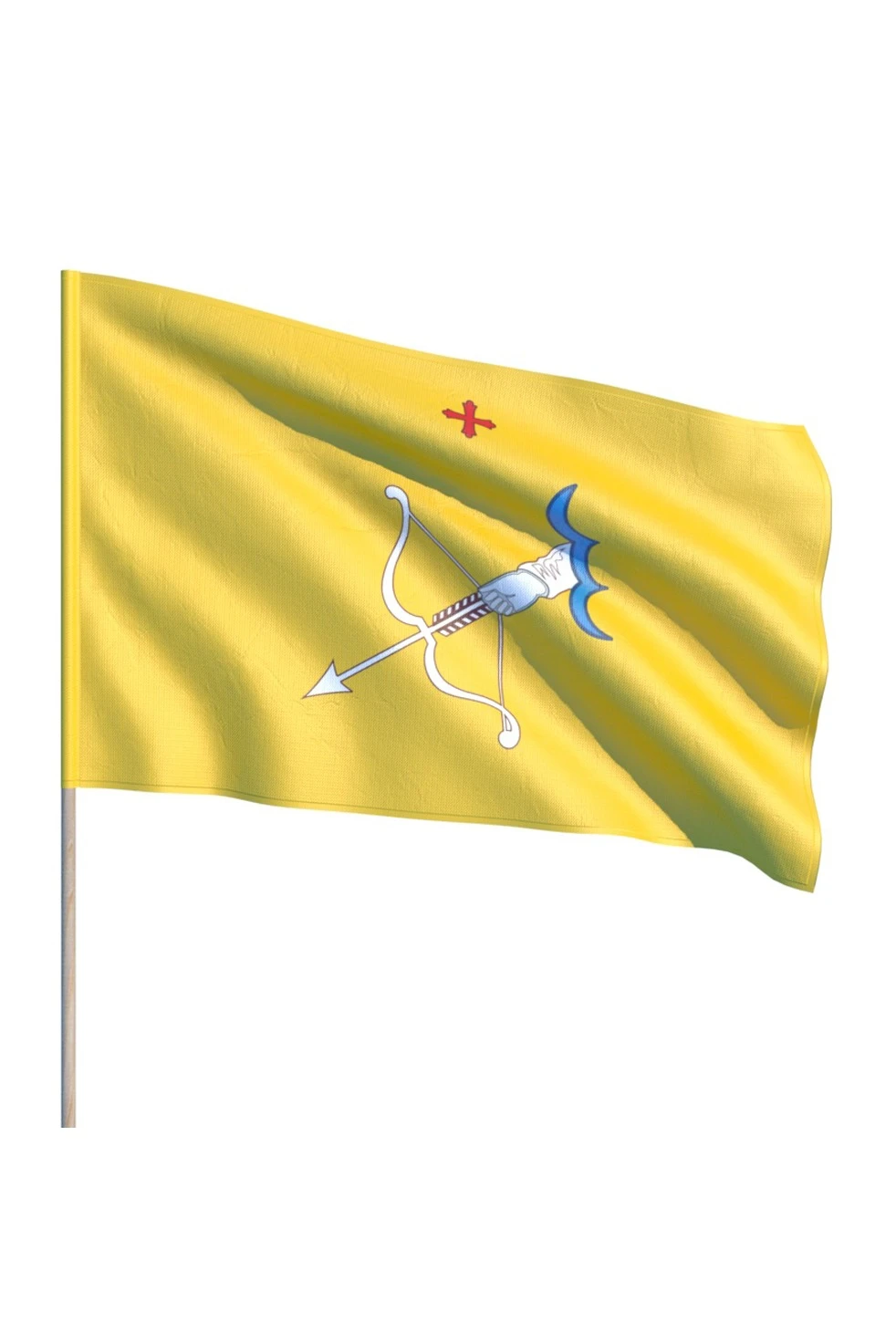 Описание. Флаг практически полностью повторяет городской герб. Прямоугольное полотнище золотистого цвета. В центре герба изображена рука алого цвета, которая выходит из облака, направленная вниз по диагонали. Она натягивает тетиву лука с одной единственной стрелой. Сверху композиции помещен алый клинчатый крест.
