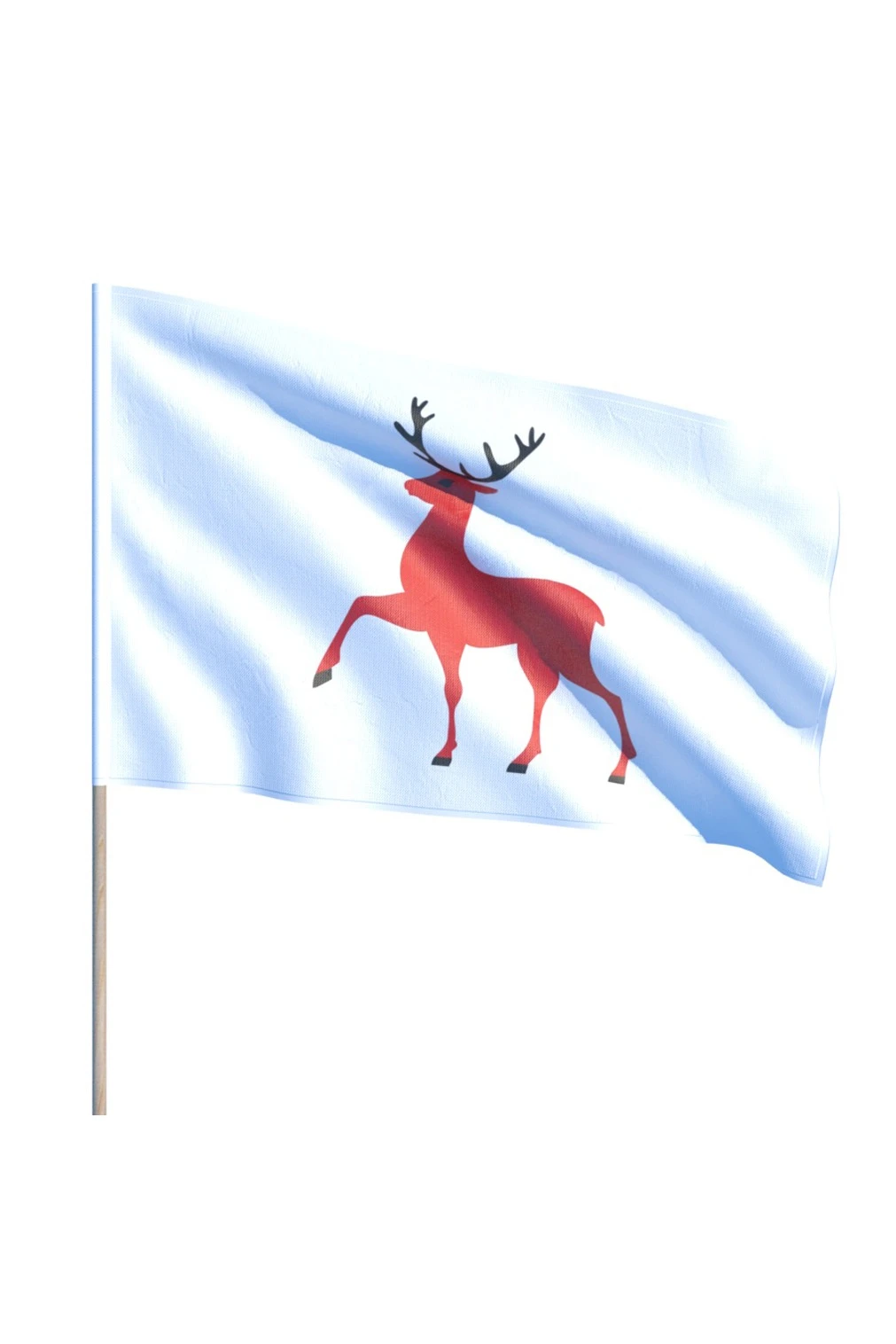 Для тех, кто хочет заказать флаги в Нижнем Новгороде, будет интересно познакомиться с историей региональной символики. Флаг, символизирующий Нижний Новгород, - это прямоугольное белоснежное полотнище с соотношением сторон 2 на 3. В центре флага имеется изображения оленя в профиль с гордо поднятой головой, увенчанной ветвистыми рогами. Переднюю ногу олень держит вытянутой. Сам олень ярко-бурого цвета, рога, глаза и копыта окрашены в чёрный цвет.