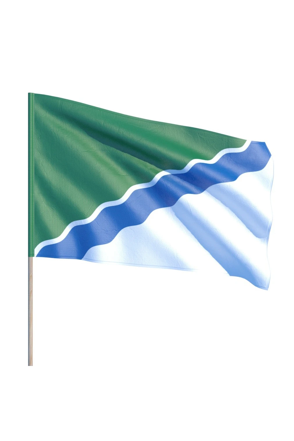Описание символа. Флаг представляет собой полотнище в виде прямоугольника, стороны которого соотносятся как 2 к 3. По диагонали, от левого нижнего угла до правого верхнего, оно разделено на две части разных цветов. Граница раздела выделена неширокой волнистой полосой. Цветовое сочетание компонуется следующим образом: