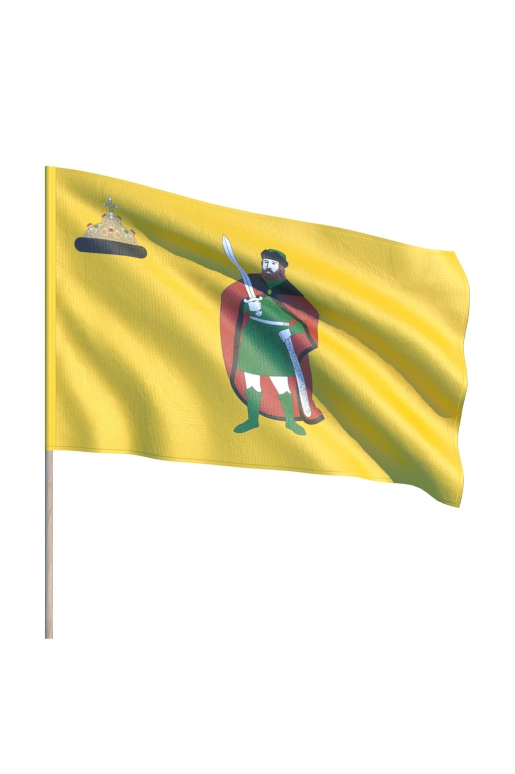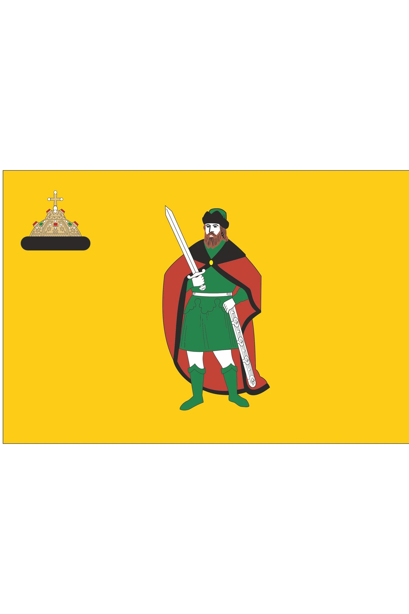 Это полотнище прямоугольной формы с традиционным соотношением ширины к длине – два к трем. Цвет флага – желто-золотистый. По центру размещена фигура князя – та же, что изображена на гербе Рязани. Размер фигуры – три четвертых от ширины полотна. В крыже (так называется верхний угол флага у древка) мы видим изображение шапки Мономаха. Высота шапки составляет около четверти ширины флага.
