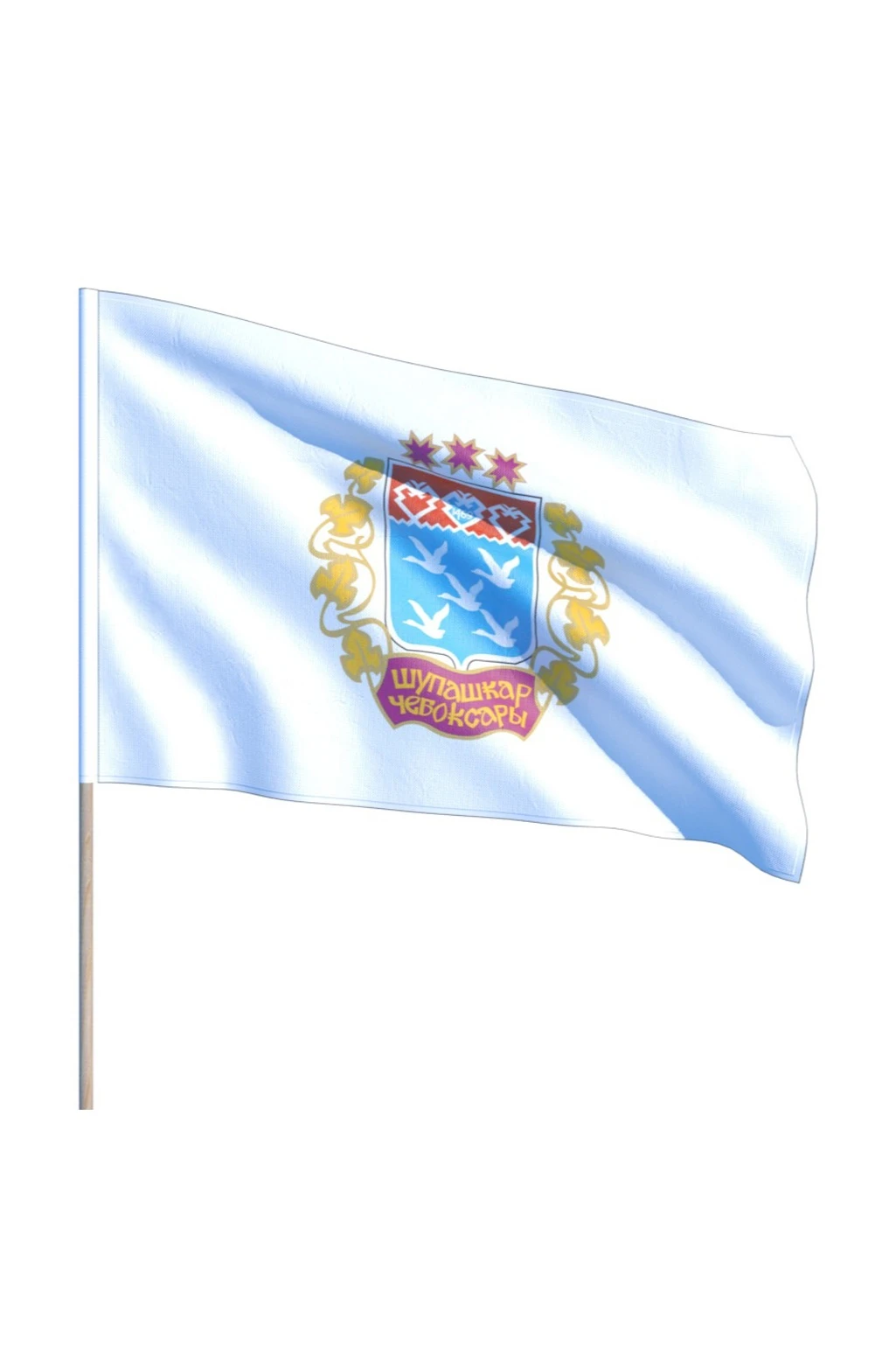 На современном геральдическом символе чувашской столицы есть несколько элементов. Три пурпурные звезды – солярные знаки, обозначающие девиз «Были, есть и будем», изображенный на Государственном гербе Чувашской Республики.