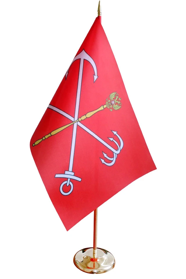 Описание. Флаг Санкт-Петербурга представляет собой прямоугольное полотнище красного цвета, в центре которого изображены два перевернутых белых якоря - морской и речной, положенных накрест, и на них золотой скипетр с двуглавым орлом. Отношение ширины флага к его длине 2:3.