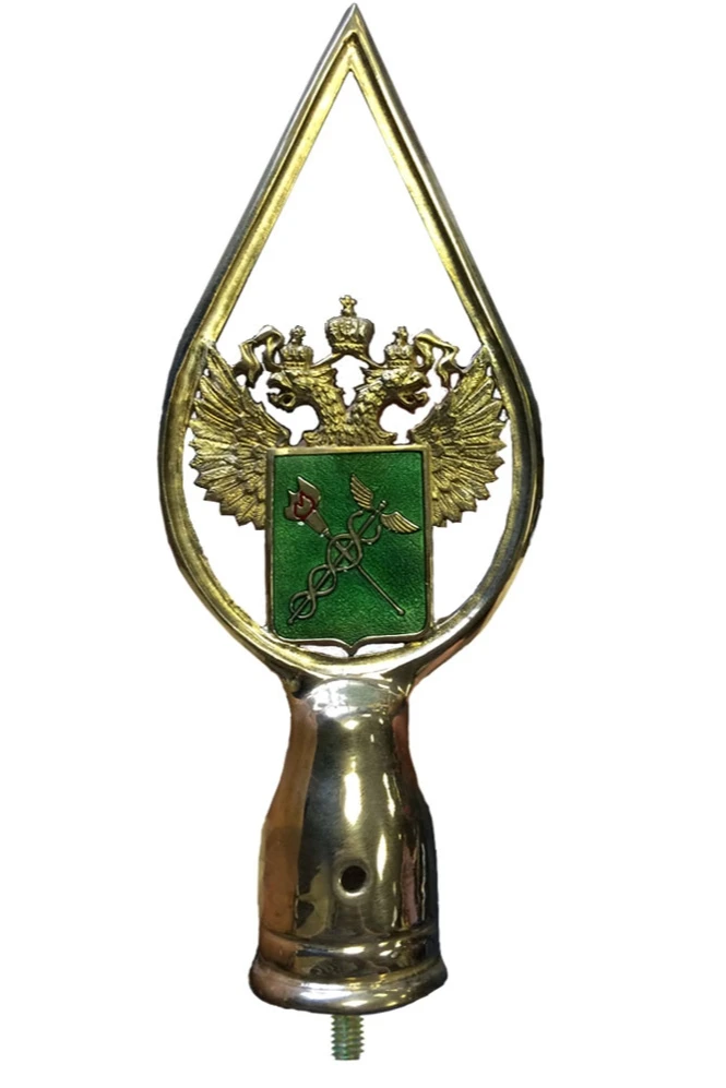 Металлическое навершие с гербом Федеральной таможенной службы РФ выполнено в золотистом цвете. Закрепив этот декоративный элемент на древке поверх флага, можно получить стилистически завершенную композицию. В куполе навершия находится двуглавый орел с большим зеленым щитом, на котором изображена официальная символика таможенной службы.