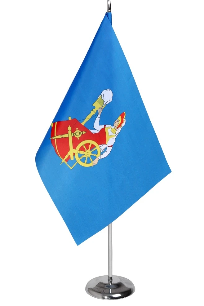 Флажок из атласа изготавливается из одного слоя, либо двух слоев ткани склеенными между собой. Нанесение выполнено методом сублимации.
