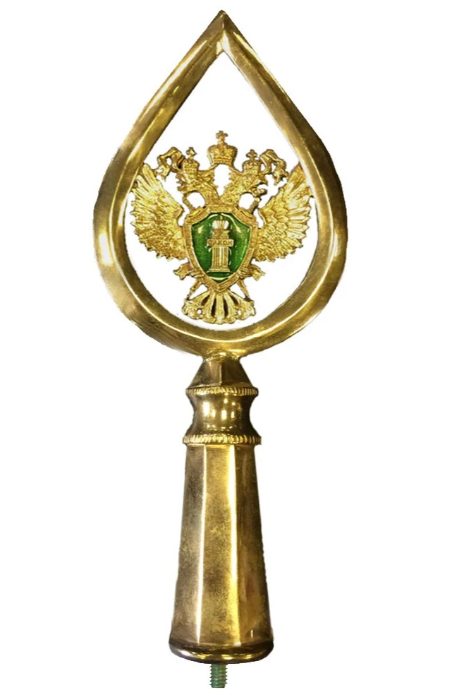 Навершие с гербом Прокуратуры, изготовленное из металла и выполненное в золотистом цвете, создано с учетом стандартов, применимых к официальной символике ведомства. Этот декоративный элемент надежно закрепляется на древке и венчает флаговую композицию, выступая ее эффектным дополнением.