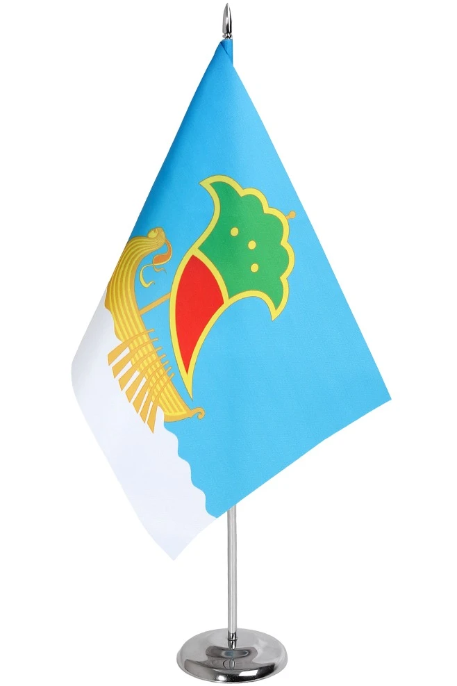 Флажок из атласа изготавливается из одного слоя, либо двух слоев ткани склеенными между собой. Нанесение выполнено методом сублимации.