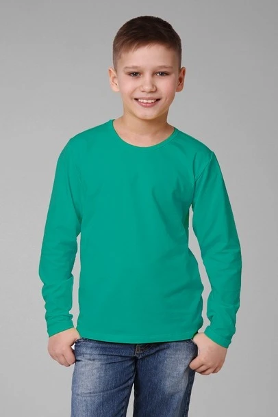 Модель. Прямой силуэт. Рукав длинный. Лонгслив имеет боковые швы без разрезов по низу изделия. Обработка горловины руликом (кантом) из основной ткани в цвет лонгслива или другого цвета. Форма ворота О-образная. Возможно бесплатное комбинирование деталей разных цветов (например, рукава могут отличаться по цвету от остальных деталей).