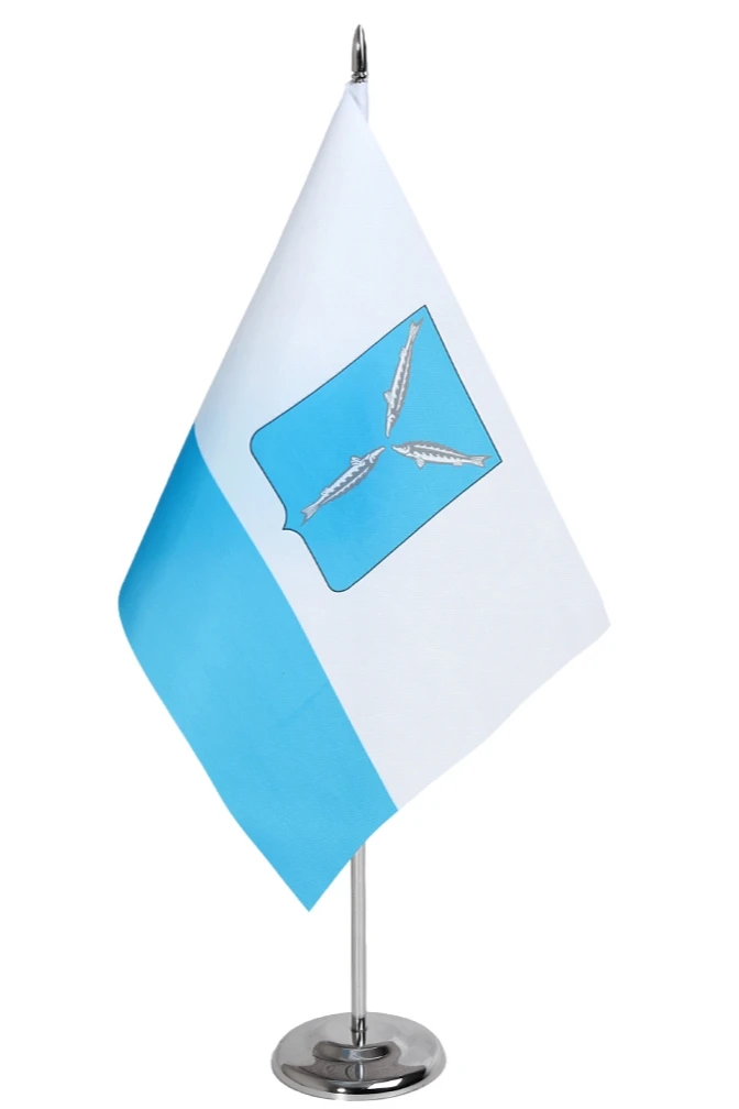История и символика. Флаг Саратова – это прямоугольник с классическим для флагов соотношением ширины к длине как два к трем. Основной цвет полотна – белый, но в его нижней части мы видим полосу голубого цвета. Ее ширина составляет одну треть общей ширины флага. В центре флага изображен герб города Саратова на голубом щите. Все цвета флага несут смысловую нагрузку, и печать флагов в Саратове от «Инари» стремится к четкой цветопередаче полотнища.