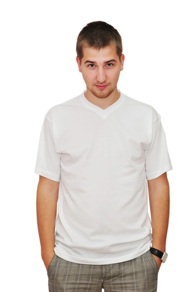 Модель. Прямой силуэт. Рукав короткий. Футболка имеет боковые швы без разрезов по низу изделия. Обработка горловины - планка из основной ткани. Форма ворота О -образная.
