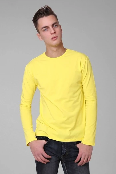Модель. Прямой силуэт. Рукав длинный. Лонгслив имеет боковые швы без разрезов по низу изделия. Обработка горловины руликом (кантом) из основной ткани в цвет лонгслива или другого цвета. Форма ворота О-образная. Возможно бесплатное комбинирование деталей разных цветов (например, рукава могут отличаться по цвету от остальных деталей).