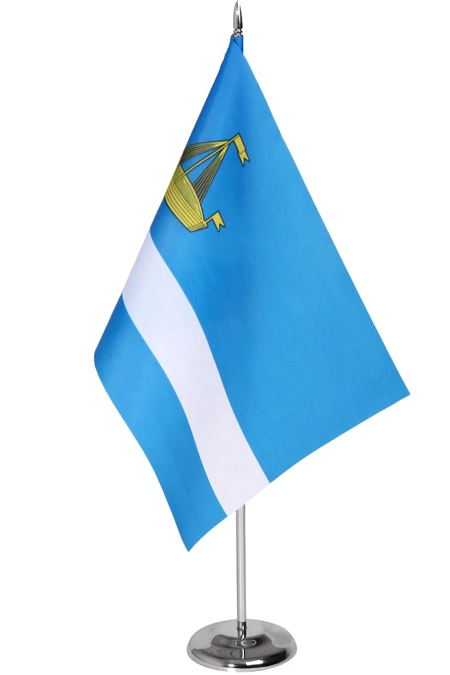 Описание. Флаг города Тюмени представляет собой полотно, которое имеет форму прямоугольника. Фон флага выкрашен в синий цвет. У полотнища есть определенное соотношение высоты к длине. Оно составляет 2:3 и состоит из трёх горизонтальных полос синего (вверху и внизу, шириной в 3/5 и 1/5 от высоты полотнища соответственно) и белого цветов (средняя полоса, шириной в 1/5 от высоты полотнища). В верхней части со стороны, которая примыкает к древку, изображено желтое судно с мачтой, но без парусов, с рулём и двумя флюгерами: на мачте и на носу. Этот композиционный элемент был перенесен на флаг Тюмени с герба города. Габаритные размеры корабля составляют 1/3 от высоты полотнища и 1/4 от длины полотнища. Обратная сторона флага Тюмени повторяет лицевую сторону зеркально. Чтобы купить флаг в Тюмени, где находится филиал «Инари», вам достаточно связаться с нашими менеджерами онлайн или по телефону.