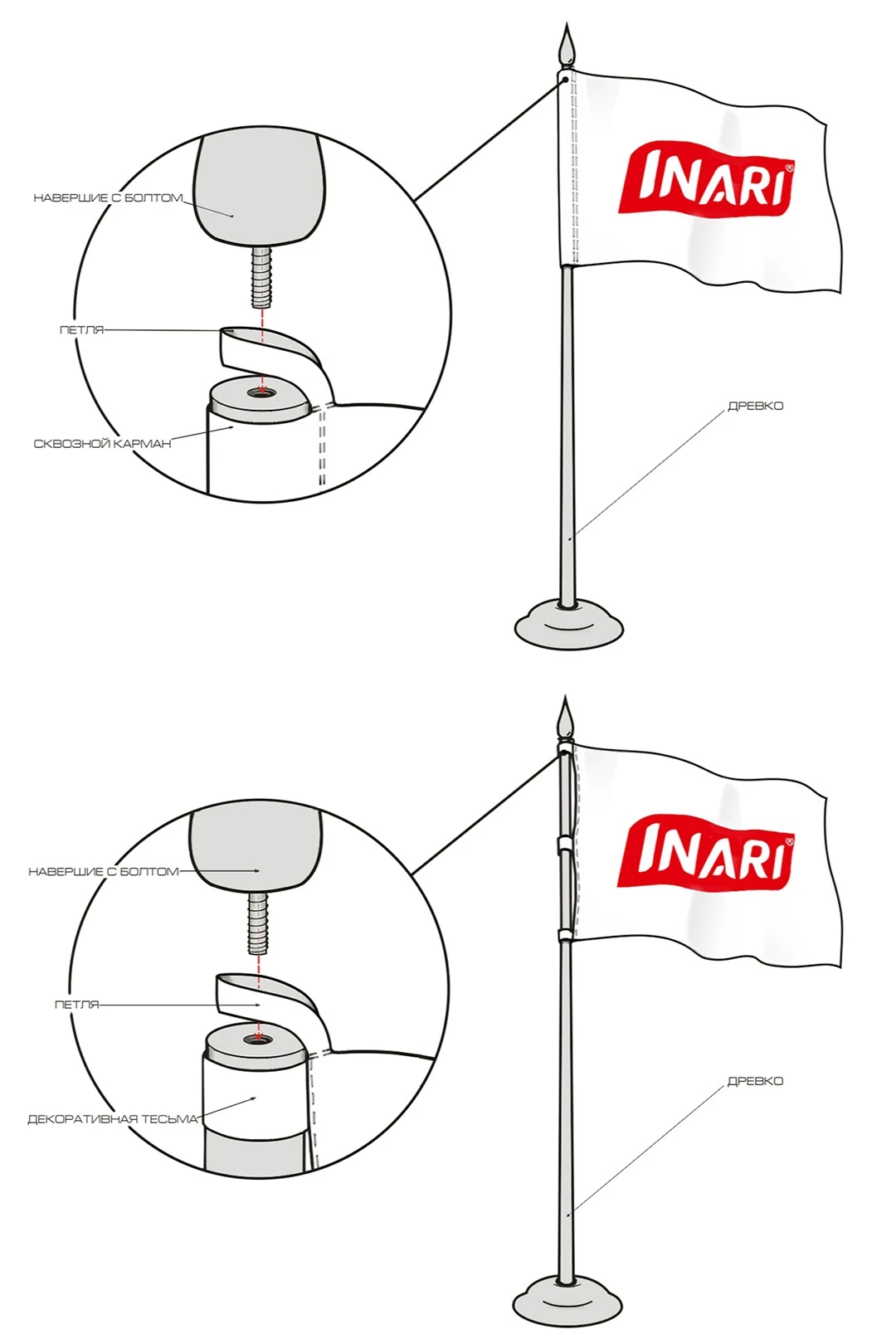Способы крепления: стандартным видом крепления является карман с левой стороны 6 см в сложенном виде (для древка диаметром 3,5 см). С верхней стороны кармана выполняется вертикальная петля для крепления знамени на древке.