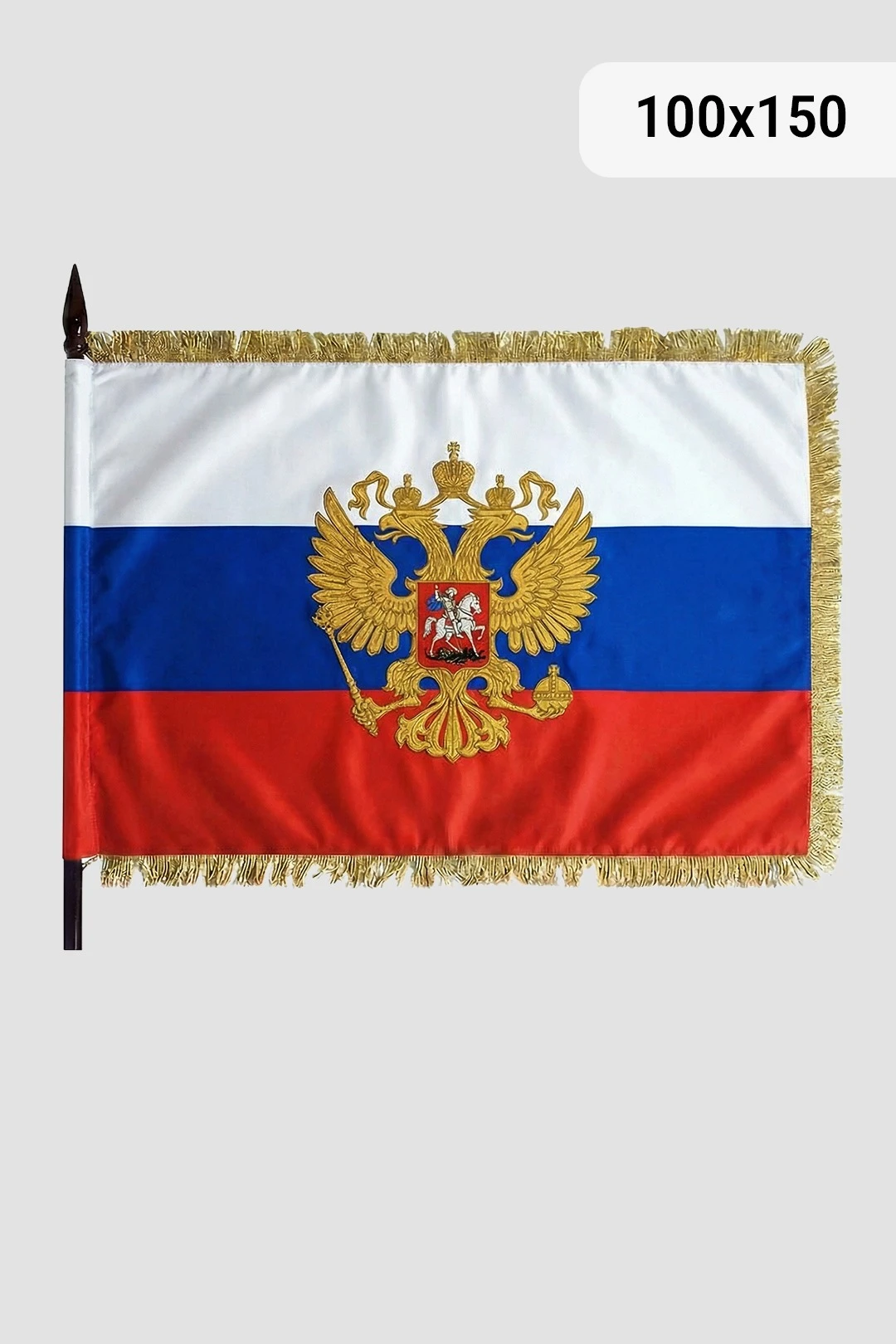 Знамя РФ вышитое – атрибут принадлежности Российской Федерации VIP-класса. Знамя России с вышитым гербом на нём отлично украсит интерьер кабинета или другого помещения. Так же вышитое знамя России может служить отличным подарком для чиновника или руководителя. Знамя России с вышитым орлом отлично дополняется знамёнными кистями золотого цвета, которые сочетаются с цветом бахромы и золотыми нитями вышивки.