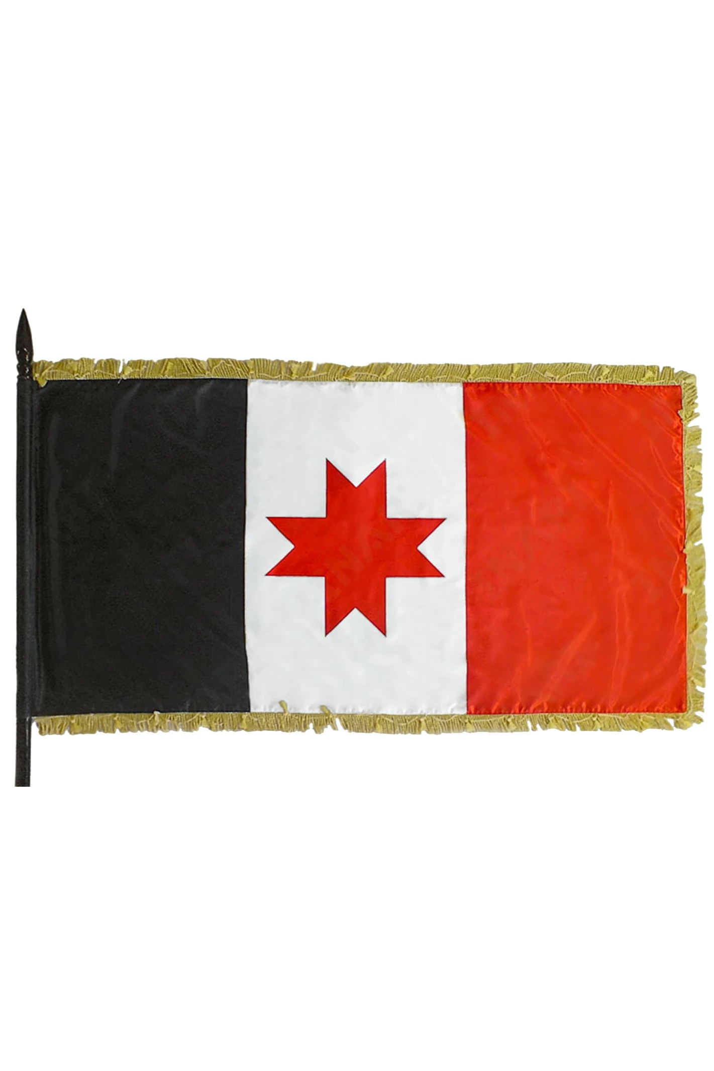 Способ крепления: карман с левой стороны 6 см в сложенном виде (для древка диаметром 3,5 см). С верхней стороны кармана выполняется вертикальная петля для крепления знамени на древке.