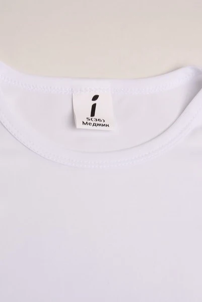 Модель. Прямой силуэт. Рукав короткий. Футболка имеет боковые швы без разрезов по низу изделия. Обработка горловины руликом (кантом) из основной ткани. Форма ворота О-образная.