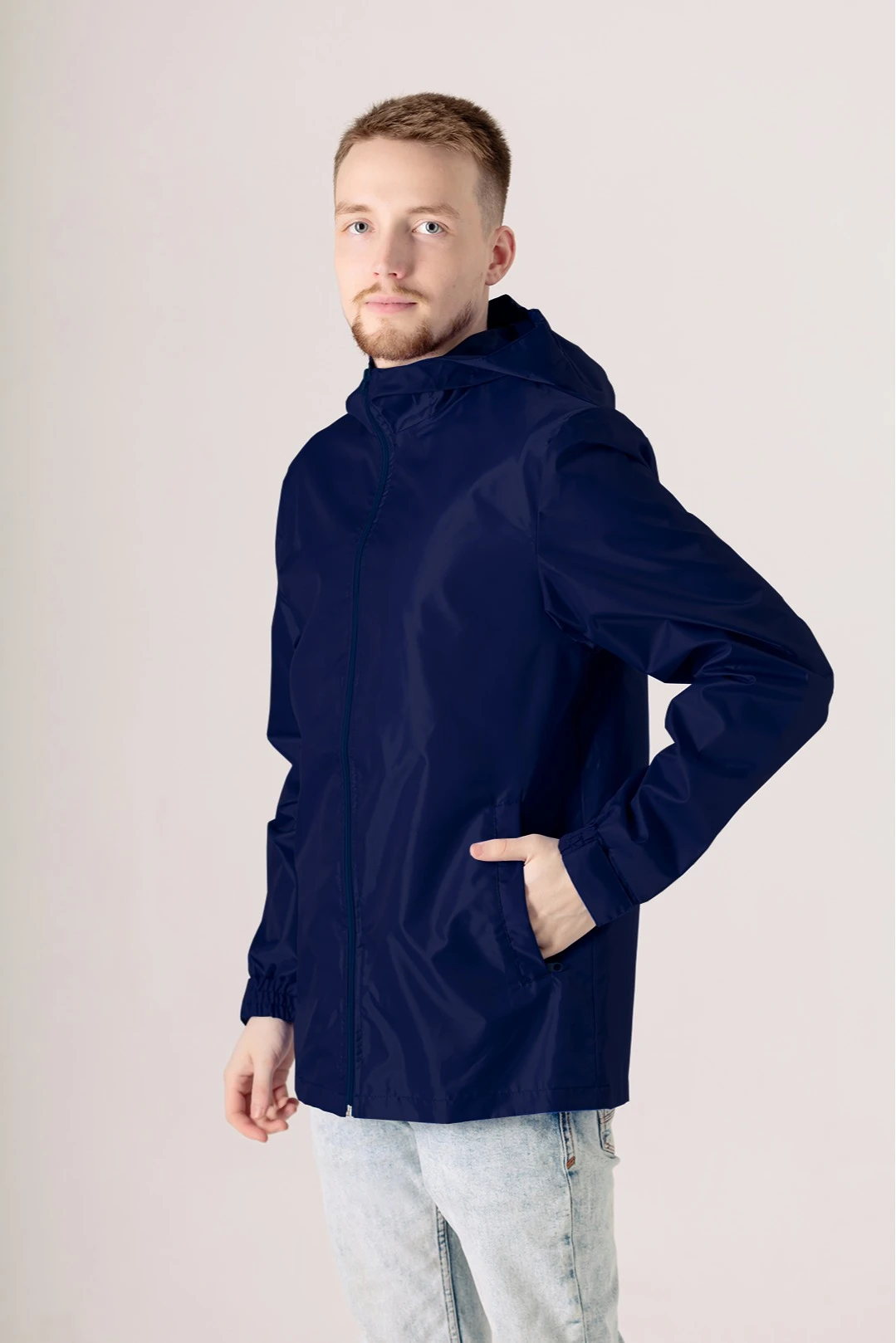 Модель. Ветровка Рэйн прямого силуэта с длинным рукавом с манжетой на резинке с липой. Ветровка на молнии без подклада. Капюшон пришивной, на верхней части у края капюшона пришита резинка для удобства. Два прорезных кармана в листочку на молнии. Низ изделия прошит в подгибку, без фиксаторов.