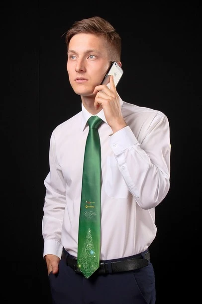 Модель: Галстук мужской самовяз. На расстоянии 18 см от нижнего края галстука пришита шлевка, для фиксации кончика галстука. Шлевка из репсовой ленты шириной 1,5 см с двухсторонней печатью (оборотная сторона только с фоновой заливкой). Галстук шьется вручную.