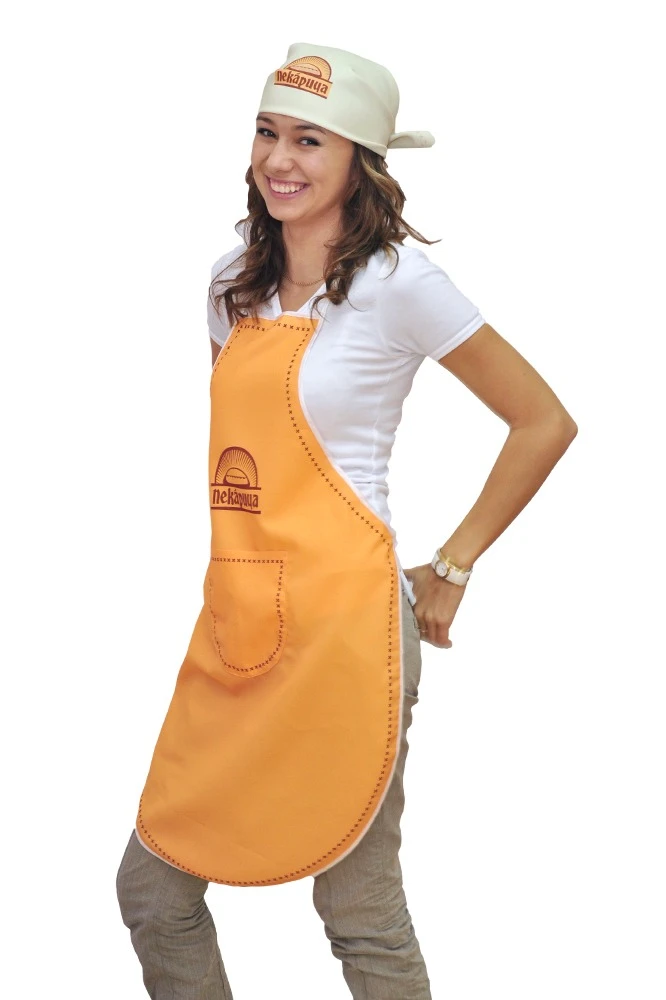 Модель: Фартук фигурной формы (форма низа закругленная), пошит с одним карманом 20х25 см. Также фартук может быть пошит с двумя карманами 13х16 см. Фартук по периметру обрабатывается косой бейкой стандартных цветов. Завязки и шейная петля выполнены из косой бейки.