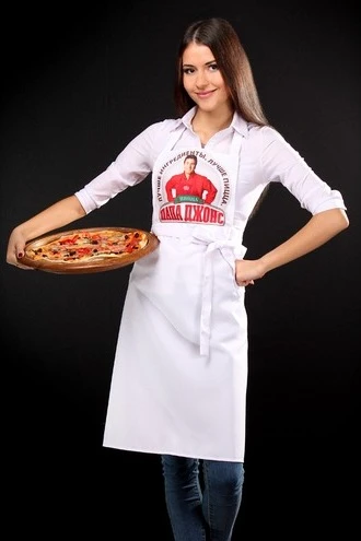 Модель: Фартук фигурной формы без разреза и карманов. За дополнительную плату фартук может быть пошит с одним карманом 20х35 см, либо двумя карманами 17х20 см. Фартук по периметру обработан швом вподгибку. Шейная петля и пояс выполнены из основной ткани. Шейная петля без пластикового регулятора. По желанию клиента шейная петля может быть выполнена с пластиковым регулятором (оплачивается дополнительно). За дополнительную плату фартук может быть удлинен до 15 см.