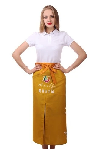 Модель: Фартук прямоугольной формы с разрезом по центру. Фартук имеет карман 21х46 см, расположенный по центру. Карман разделен на три отсека. Фартук по периметру обработан швом вподгибку. Пояс выполнен из основной ткани. За дополнительную плату фартук может быть удлинен до 15 см.
