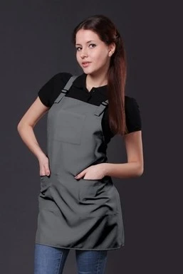 Модель: Фартук фигурной формы без разреза. Фартук по периметру обработан швом вподгибку. Фартук может быть изготовлен с одним карманом 18х70 см, разделенным на 6 отсеков, либо с тремя карманами: два боковых 18х20 см и один карман на груди 13х12 см. Креплением служат перекрещивающиеся на спине лямки. Лямки из основной ткани фиксируются на груди с помощью двух пластиковых регуляторов черного цвета. В районе пояса лямки продеваются через два никелированных люверса диаметром 15 мм.