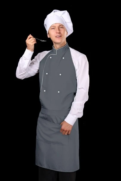 Модель: Фартук фигурной формы без разреза и карманов. За дополнительную плату фартук может быть пошит с одним карманом 20х35 см, либо двумя карманами 17х20 см. Фартук по периметру обработан швом вподгибку. Воротник и пояс выполнены из основной ткани. Воротник на липе. На груди выполнен запа́х, обшитый кантом золотого или серебряного цветов. Установлены поварские пукли белого цвета (6 шт). За дополнительную плату фартук может быть удлинен до 15 см.