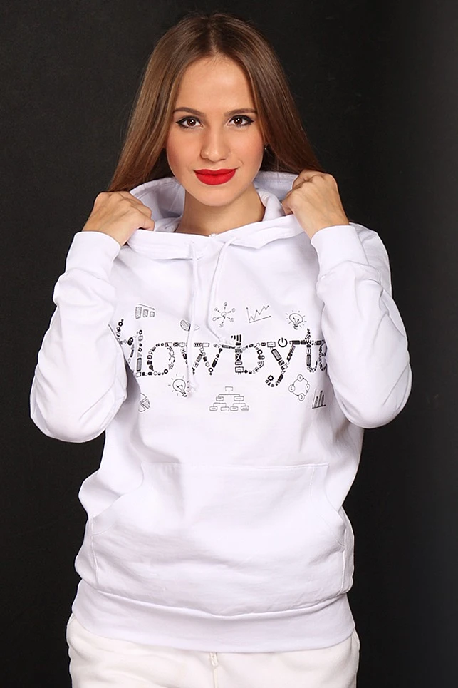 Модель. Толстовка унисекс с прямым силуэтом. Длинные рукава с манжетами. Манжеты рукавов и низ толстовки обработаны тканью рибана (специальная тканая резинка) в цвет толстовки. Толстовка с капюшоном и накладным карманом «кенгуру». В капюшон продет плоский шнур, у которого запаяны концевики. Капюшон с подкладом из кулирной глади в тон футера.