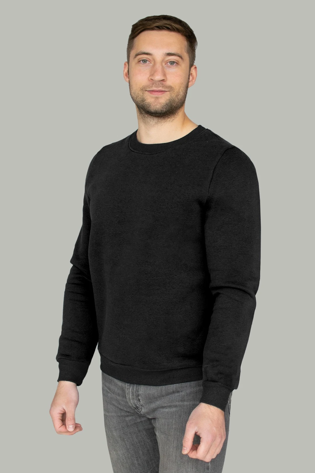 Модель. Прямой силуэт. Толстовка без молнии. Длинные рукава. Низ толстовки и рукавов, а также горловина обработаны тканью кашкорсе (специальная тканная резинка) в цвет толстовки. Толстовка без капюшона и карманов.
