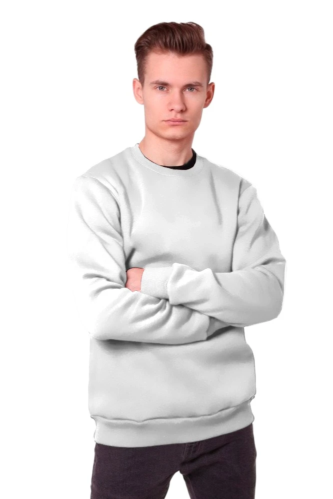 Модель. Прямой силуэт. Толстовка без молнии. Длинные рукава. Низ толстовки и рукавов, а также горловина обработаны тканью кашкорсе (специальная тканная резинка) в цвет толстовки. Толстовка без капюшона и карманов.