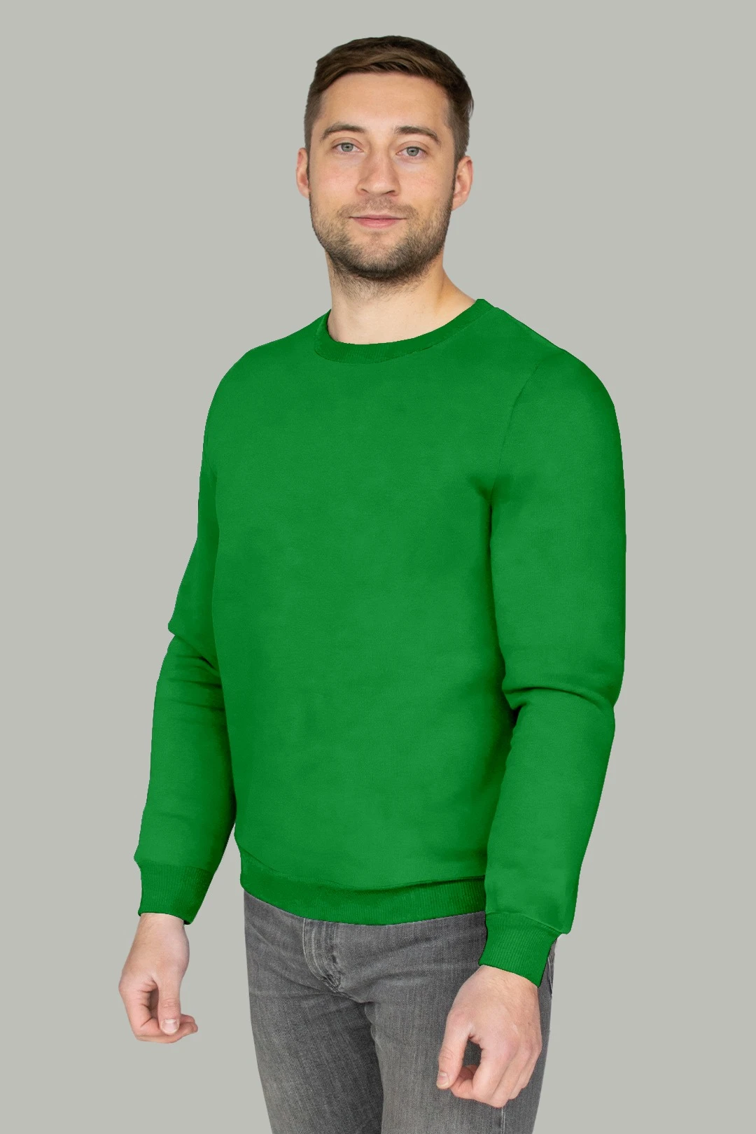 Модель. Прямой силуэт. Толстовка без молнии. Длинные рукава. Низ толстовки и рукавов, а также горловина обработаны тканью кашкорсе (специальная тканная резинка) в цвет толстовки. Толстовка без капюшона и карманов.