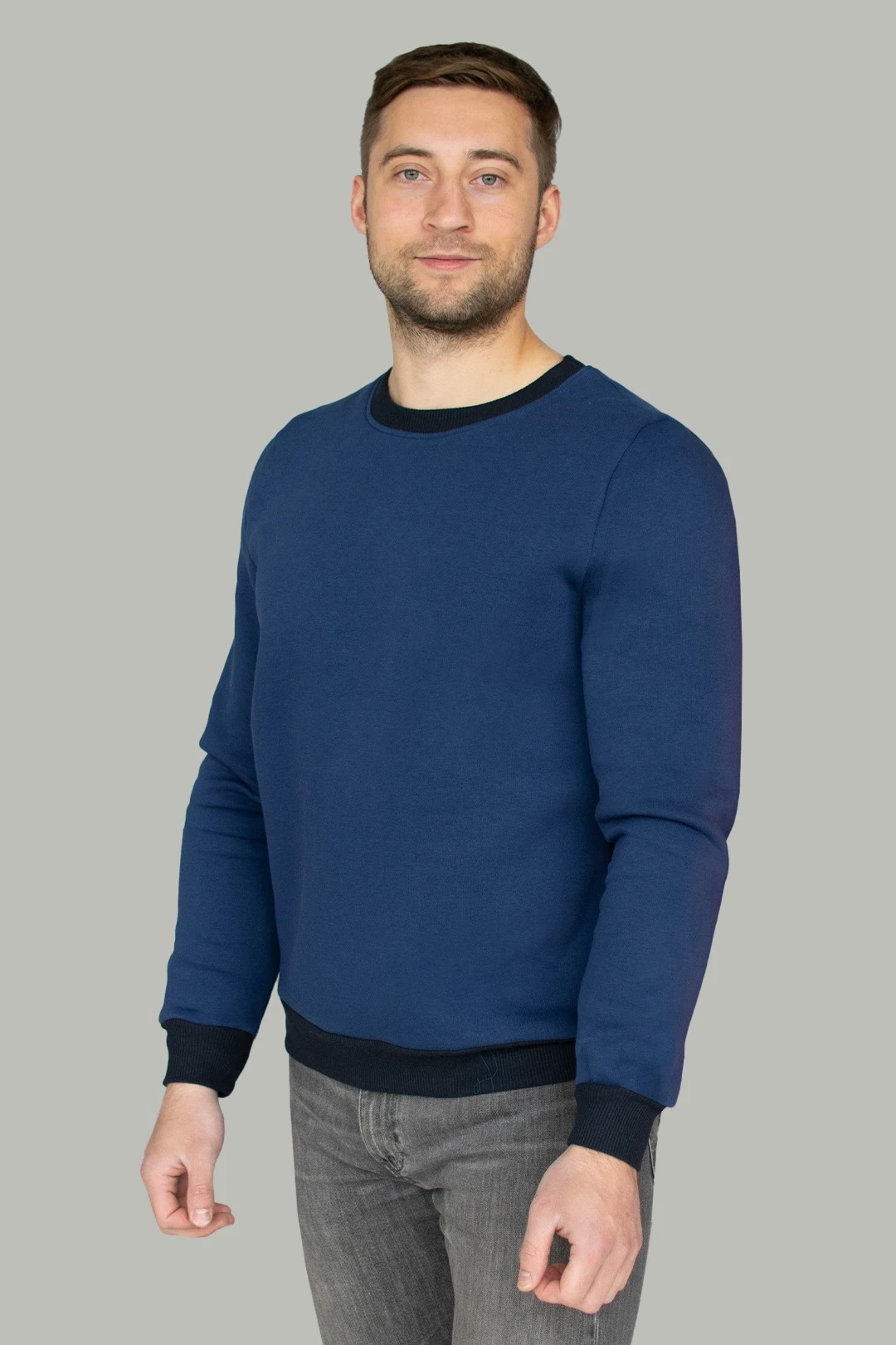 Модель. Прямой силуэт. Толстовка без молнии. Длинные рукава. Низ толстовки и рукавов, а также горловина обработаны тканью кашкорсе (специальная тканная резинка) в цвет толстовки. Толстовка без капюшона и карманов.