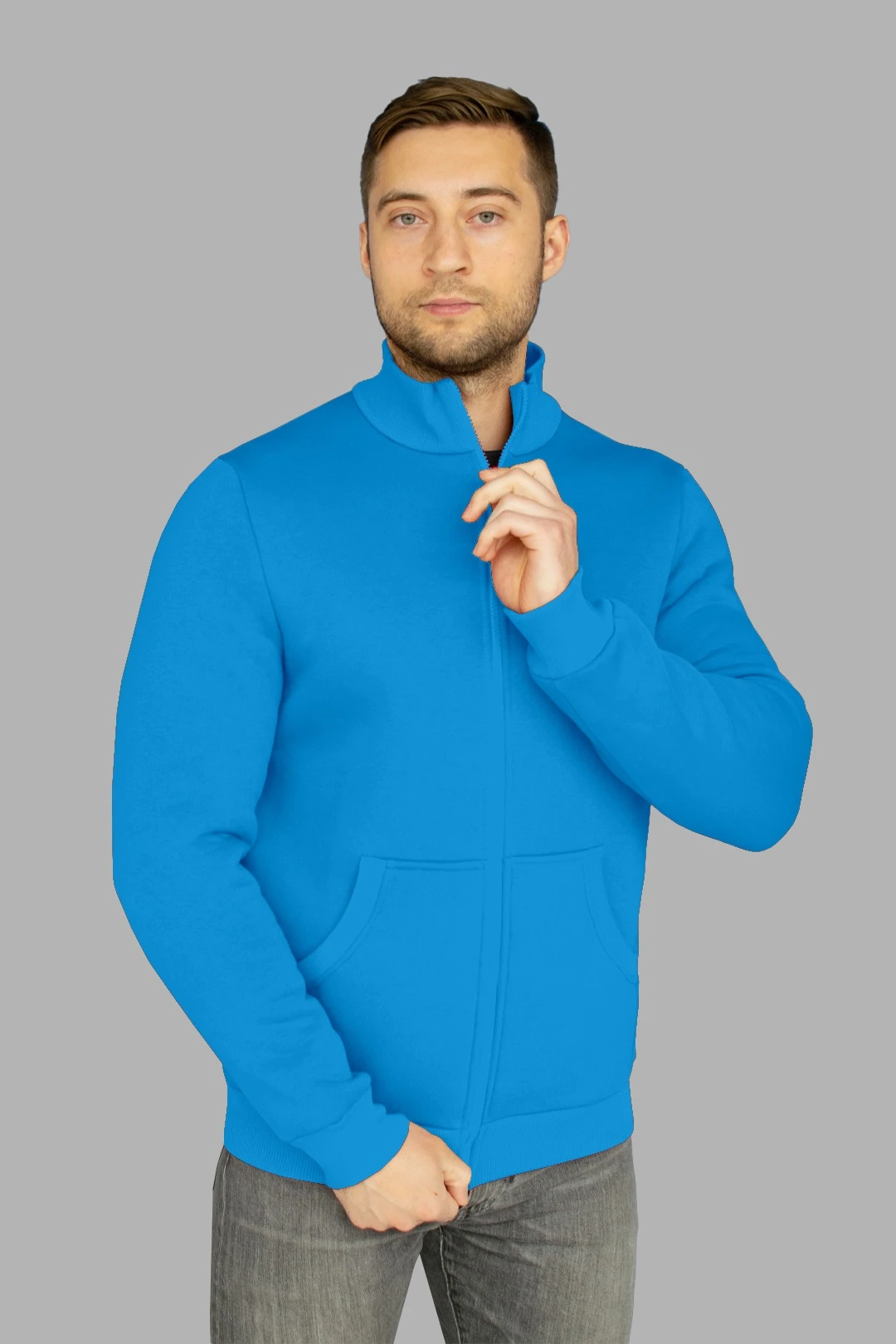 Модель. Прямой силуэт. Толстовка на молнии. Длинные рукава. Низ толстовки и рукавов, а также горловина обработаны тканью кашкорсе (специальная тканая резинка) в цвет толстовки. Толстовка без капюшона. Два раздельных кармана по типу кенгуру. Для большего удобства при открывании и закрывании на молнии установлены пуллеры.