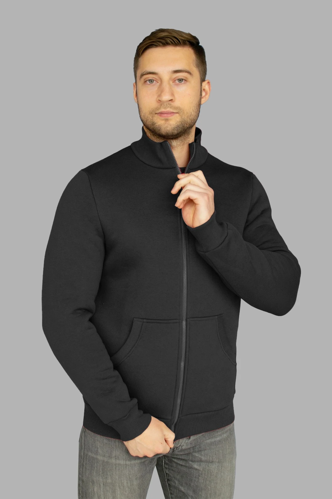 Модель. Прямой силуэт. Толстовка на молнии. Длинные рукава. Низ толстовки и рукавов, а также горловина обработаны тканью кашкорсе (специальная тканая резинка) в цвет толстовки. Толстовка без капюшона. Два раздельных кармана по типу кенгуру. Для большего удобства при открывании и закрывании на молнии установлены пуллеры.