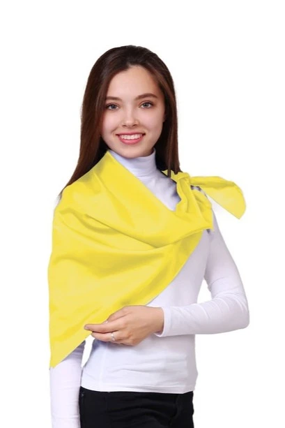 Платок однотонный — элегантное сочетание строгости и универсальности. Прекрасно подойдет для массовых мероприятий, выступлений, а так же при проведении соревнований и митингов в качестве отличительного признака. Возможно использование изделия как части форменной одежды сотрудников, работающих в сфере обслуживания.