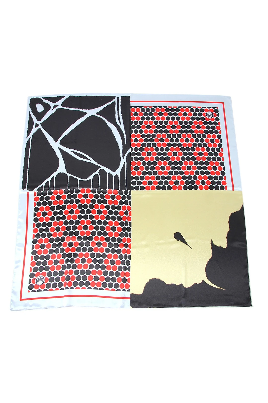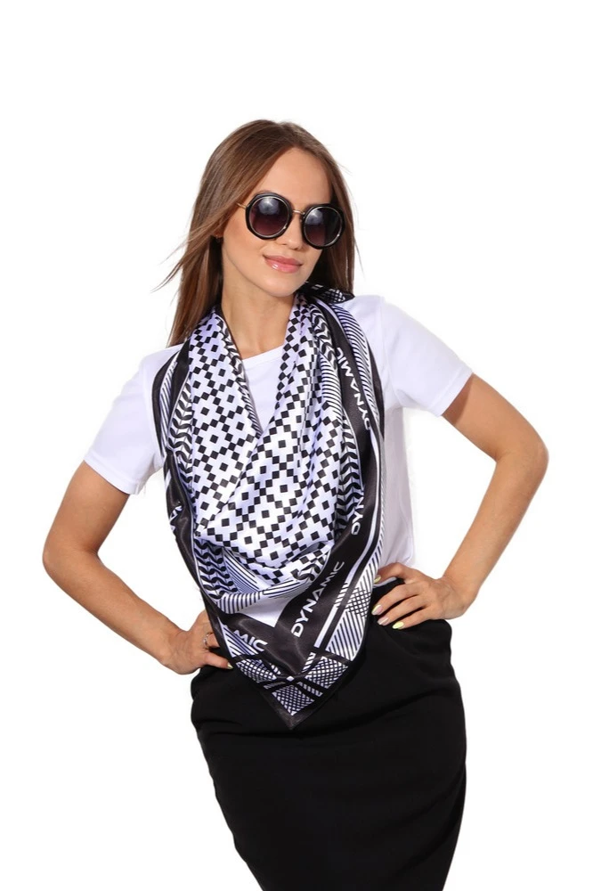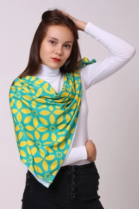 Модель: Платок квадратной формы. Края платка обрабатываются термоножом, ролевым швом, московским швом, швом по периметру с открытым срезом.