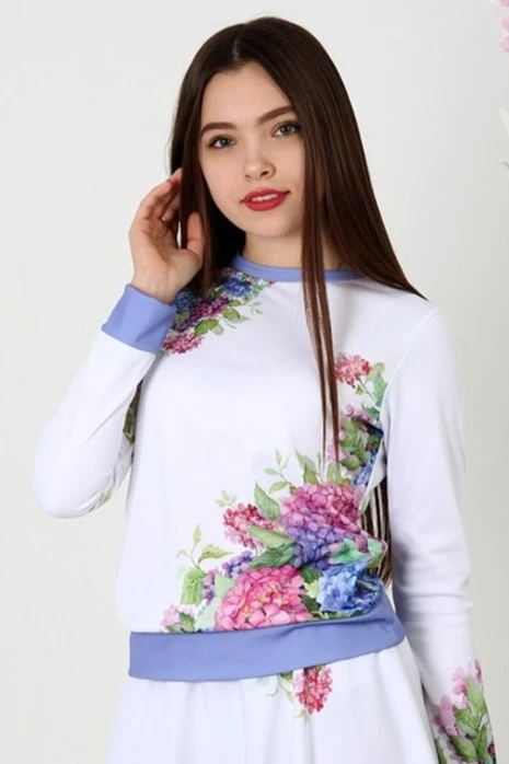 Модель. Прямой силуэт. Длинные вшивные рукава. Низ свитшота, манжеты на рукавах, а также О-образный ворот, выполнены из ткани сандвич браш. Свитшот без молнии, карманов, капюшона.