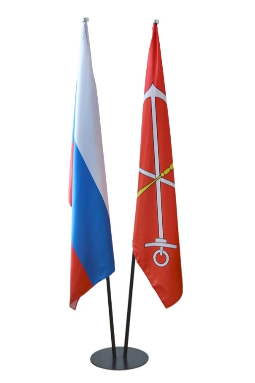 Изделия поставляются в комплекте. В состав комплекта входит: подставка напольная металлическая на 2 штока, флаг РФ печатный, флаг Санкт-Петербурга печатный.